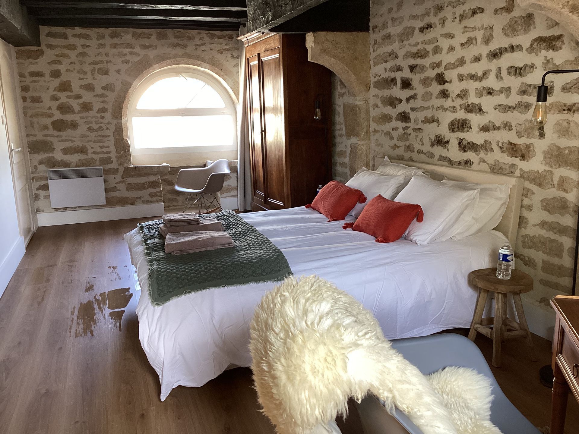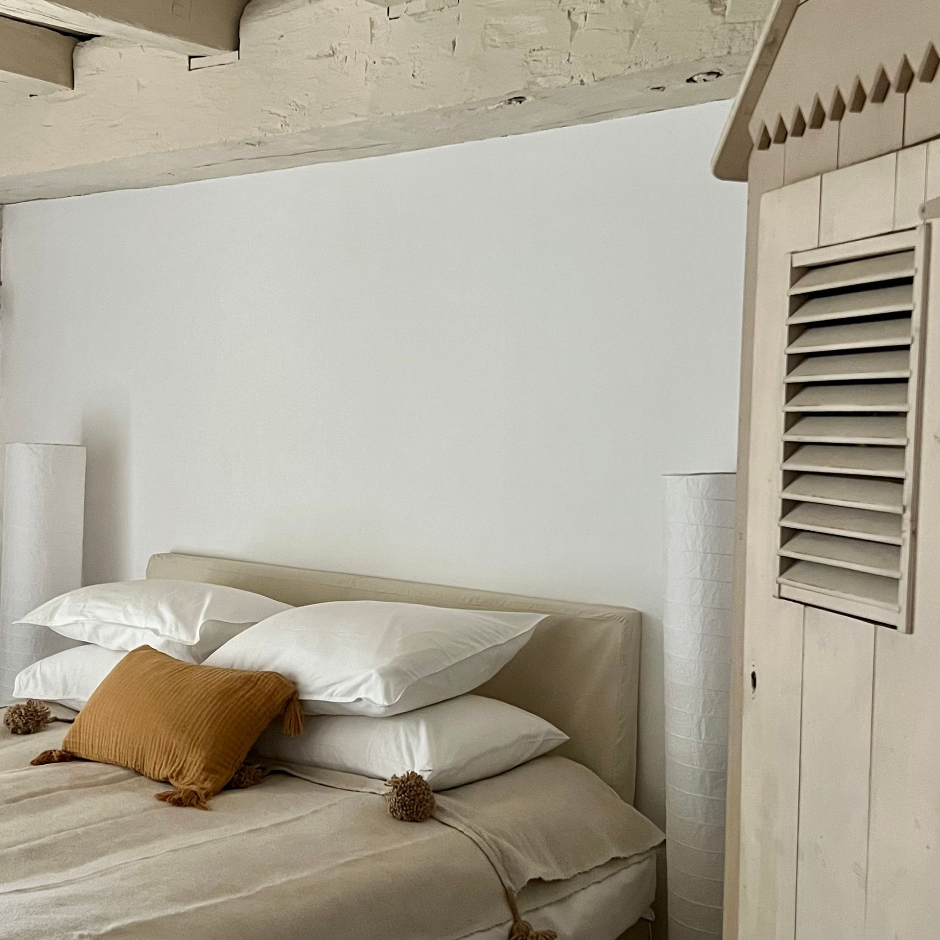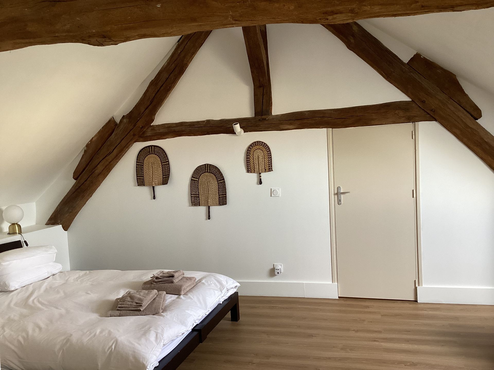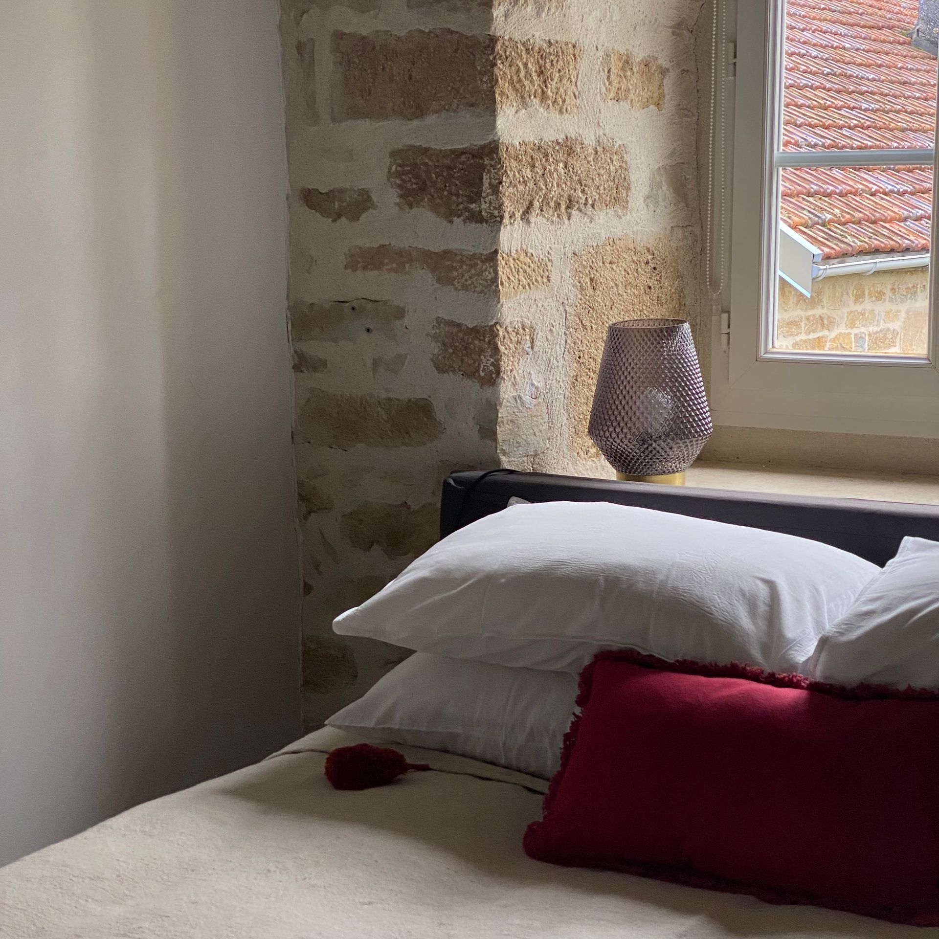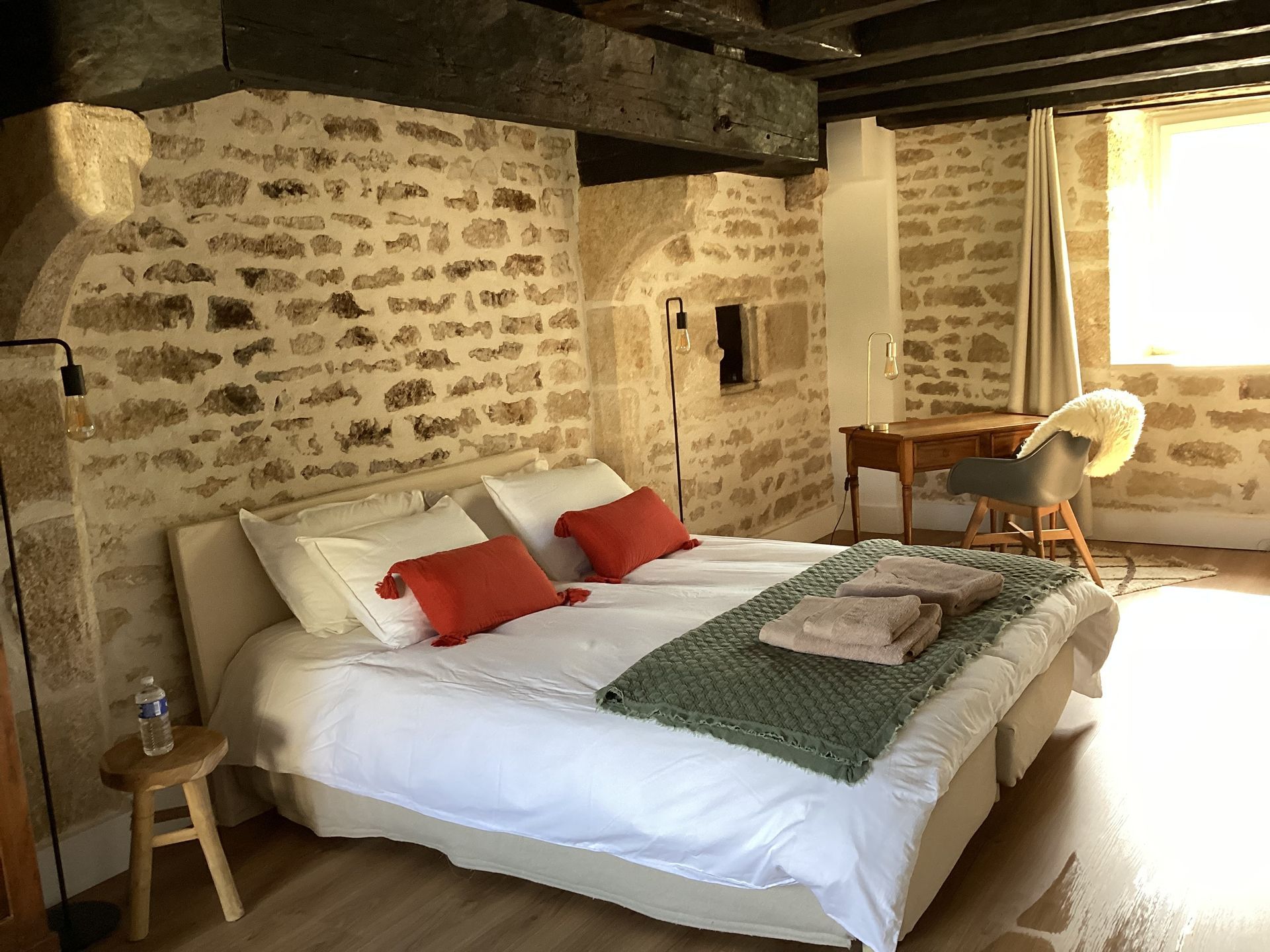 During the renovation of the house we took care to keep all the authentic elements of the house. The beams, the floors, the window seats, the fireplace found their place in the decoration. Perhaps a little to the detriment of the sound insulation of the rooms.